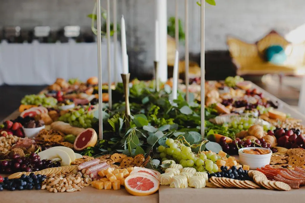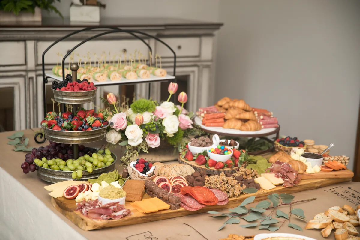 Starting with our full grazing table — that’s a huge crowd-pleaser. You get a gorgeous centerpiece, snacking station, and